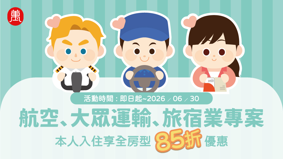 不論是在高空穿梭的機組人員、在軌道與公路上守護旅客的運輸英雄,還是同樣在旅宿前線辛勤付出的同業夥伴,承萬尊爵渡假酒店誠摯邀請您來到南投埔里,卸下疲憊,享受一場深度的療癒時光。