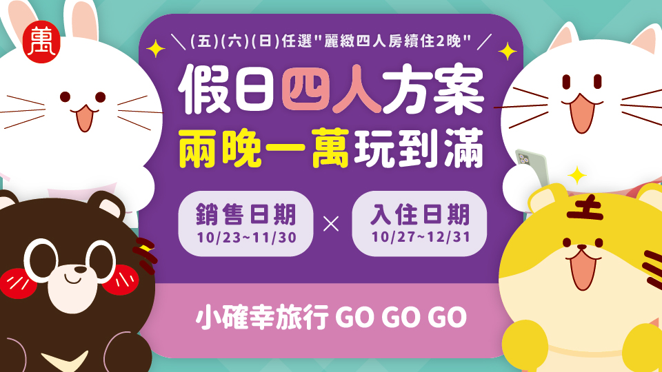 假日四人方案,兩晚一萬玩到滿(四人房)