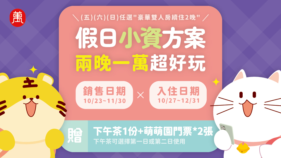 現在預訂豪華雙人房續住兩晚,讓您免去舟車勞頓的辛苦,還加碼贈送精緻雙人下午茶,以及超人氣【萌萌園】門票2張